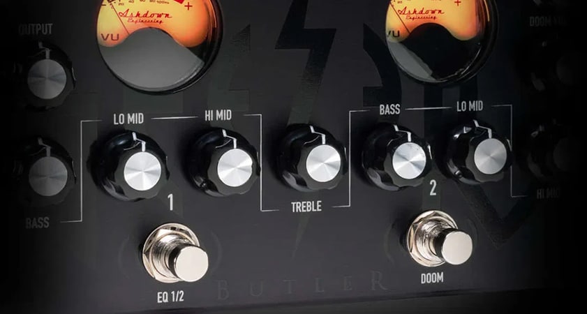 Black SabbathのベーシストGeezer Butler(ギーザー・バトラー)のシグネチャーモデル第二弾。第一弾のHEAD OF DOOMアンプを基に、さらに音をかなり細かく調整できるよう2系統(EQ1、EQ2)の独立した4バンドEQセクションと DOOMドライブが追加されています。EQ1の時は基本のEQ「BASS / TREBLE / HI MID」プラス「LO MID / HI MID」、EQ2の時は基本のEQプラス「BASS / LO MID」がさらに調整できる構成です。例えば力強く激しいサウンドと柔らかく繊細な音を2パターン仕込んでおくこともできますね。ドライブも歪みのレベル、音量が調整でき、全体の音量はOUTPUTノブでもコントロール可能。かなり微調整に富んだペダルであることは一目瞭然です。ちなみに彼の曲「Hand of Doom」のような激しい音を作り出すためにデザインされており、発売前に本人にお墨付きを得ているのもポイント。9Vでも使用できますが18V駆動がおすすめです!