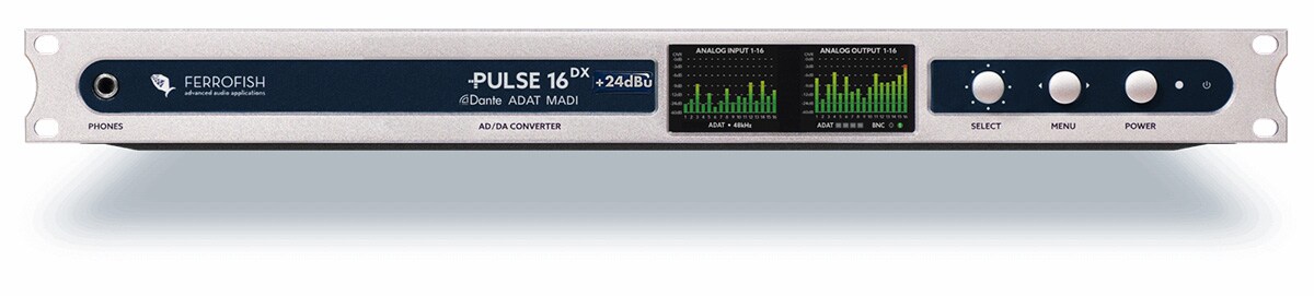 The Ferrofish Pulse16 DX +24 is an extremely cost-effective AD/DA converter designed to provide stable, uncompromising performance in professional studios and live performance environments, with 16 balanced analog inputs and outputs, 4 ADAT inputs and outputs, MADI optical inputs and outputs capable of transmitting 64 channels of audio, and Dante audio network inputs and outputs (2 x RJ45). In addition to the functions of the Pulse16 DX, the maximum reference level can be set up to +24dBu.