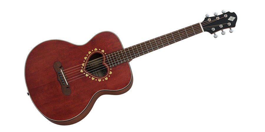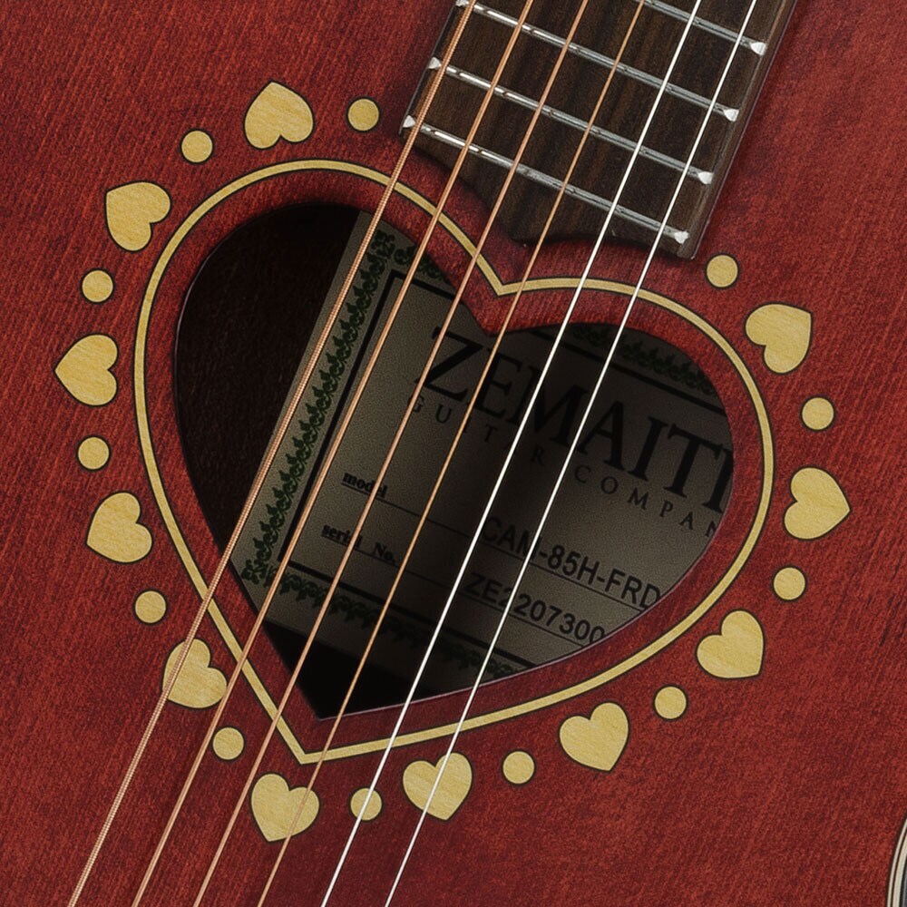 The CAM-85H is based on the popular heart sound hole mini body CAM-80H and features a maple patterned woody rosette.