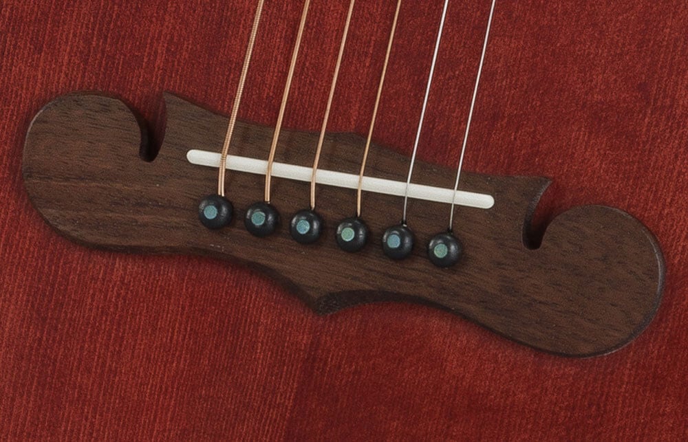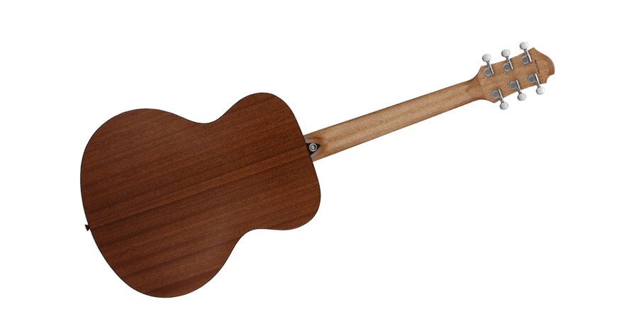 The top bracing uses forward X bracing to maximize the sound, taking into account the shape of the sound hole and the size of the body.