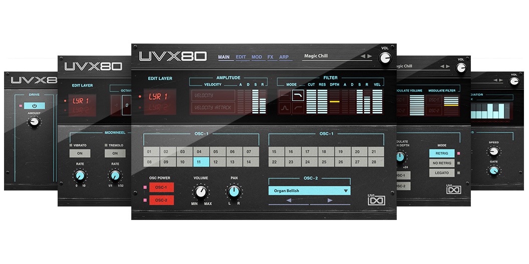 ◎The UVX80's operation screen is designed to resemble that of the actual machine. The dual layer structure of two oscillators provides 28 sound waveform presets for oscillator 1 and 111 presets for oscillator 2. Each layer provides a multi-mode filter, ADSR, pitch, portamento, stereo processing, arpeggiator, and modulation wheel assignments. In addition, a flexible LFO and 16-step modulator allow for quick manipulation of dynamic and complex sound changes. Finally, familiar high-definition studio effects: drive, chorus, phaser, delay, and reverb color the tone.