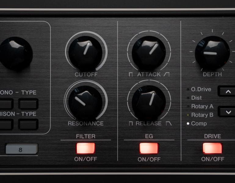 複雑なシンセサウンドを複雑な操作なく演奏できるCK。アナログスタイルのパッドやリード、ベース、ブラスにストリングス、シンセベルやテクスチャーのコントロールなど、様々な音声表現をすることができるシンセサウンドがそろっています。そしてモダンで実用的に配置されたコントローラー類は複雑なメニュー操作不要でシンセサウンドのコントロールを可能としています。上品なフィルターとエンベロープジェネレーターはサウンドのトーン、振幅をコントロール。パネル上にはワンタッチでON/OFFでき、シンセリードやペースソロに便利な3モードのモノフォニックスイッチや、音が重なり太くなる3モードのユニゾンスイッチも装備。スタブ、パッド、リード、ベースなど、マッシブなシンセサウンドを作る事も可能です。