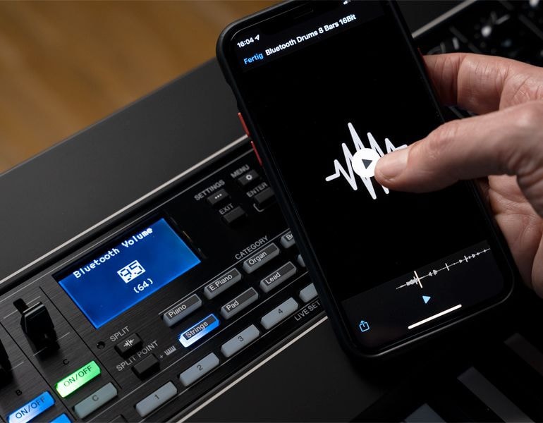 CKはBluetoothオーディオの受信に対応。スマートフォンなどを接続し、内蔵スピーカーやCKと接続したPAスピーカーからBGMや伴奏を流したりする事も可能です。