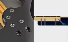 ボディ裏面から垂直にネックを固定する4本のネジに加え、ボディ裏から45度の角度でネックエンドを固定する2本のネジを追加したマイター・ボルティング方式を採用。ボディとネックを強固に密着させ、ボディとネックが一体となった強烈な鳴りを生み出します。通常のボルトオンジョイントよりも弦振動のエネルギーロスが少なく、豊かなサスティンと圧倒的な胴鳴りを実現します。