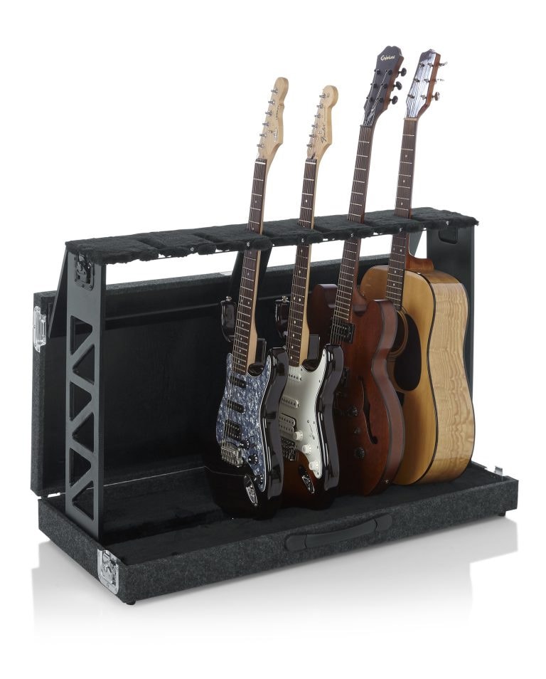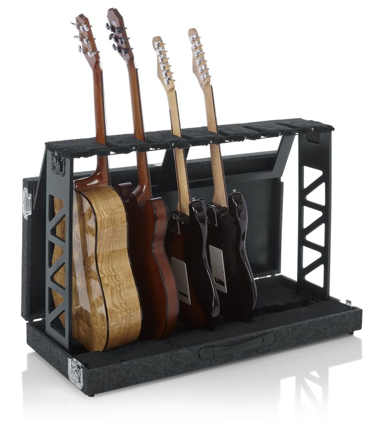 - A compact rack-style guitar stand for 6 guitars that can be stored in a case.