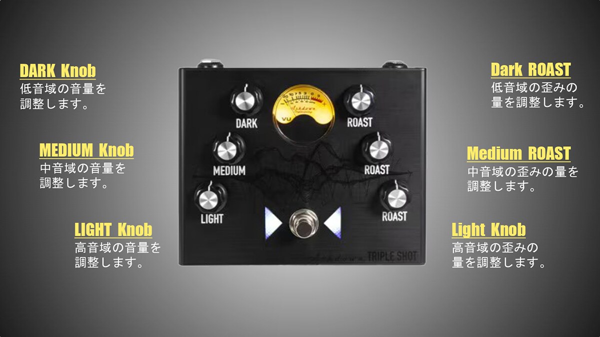 2バンドのTRIPLE SHOTと基本的に同じコンセプトのペダルですが初めてエフェクターで「VUメーター」と呼ばれるアナログ計器が搭載されたモデルです。VUメーターは音の強さや出力レベルを視覚的に表示するもので、演奏中の音のピークやレベルを確認するのに便利。また、見た目にもかっこよく、ステージでのパフォーマンスにも良いアクセントとなります。コンプ感は少なく、非常にナチュラルな歪みが好印象。アタックの感度が高く、ピック弾きに似合うと感じました。
