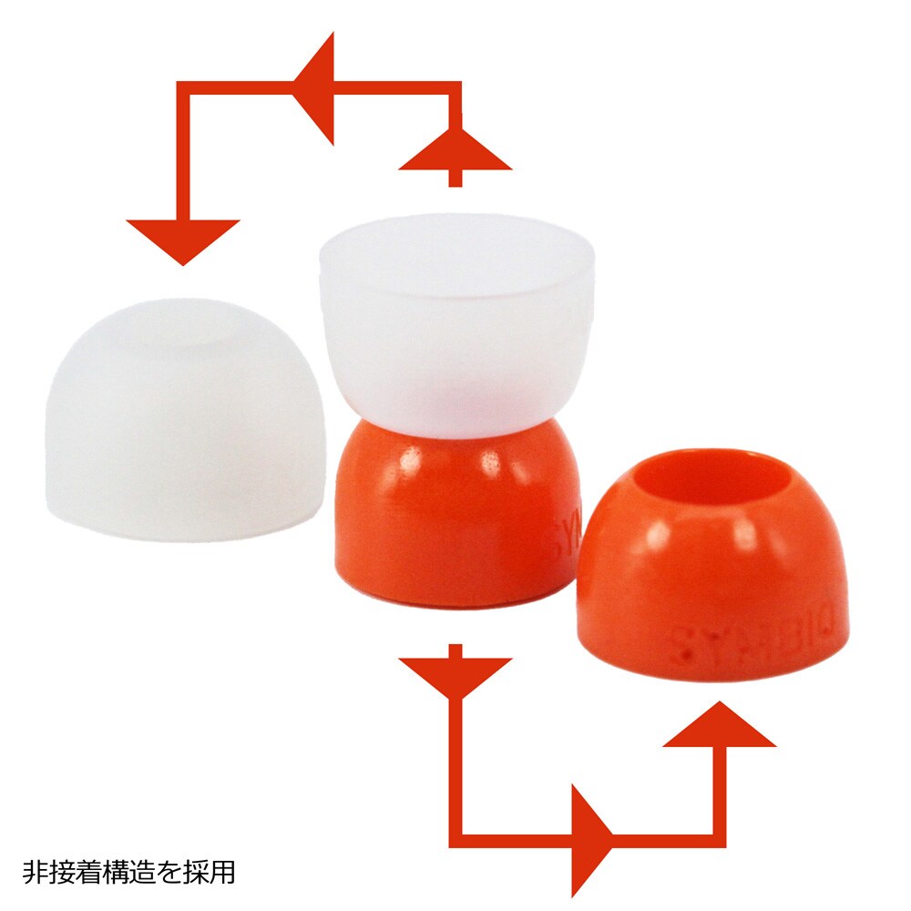 ・The hybrid structure of Symbio Eartips was designed by MandarinEs in response to the problem that many silicone ear tips could not provide a satisfactory fit and sound insulation. In order to deliver the original sound of the earphones to the eardrum regardless of the shape of the ear canal, this earpiece has a hybrid structure that combines the characteristics of silicone material with its high durability and low sound attenuation effect, and the urethane material's high sound insulation and sound dynamics.