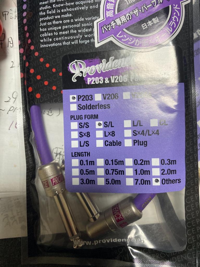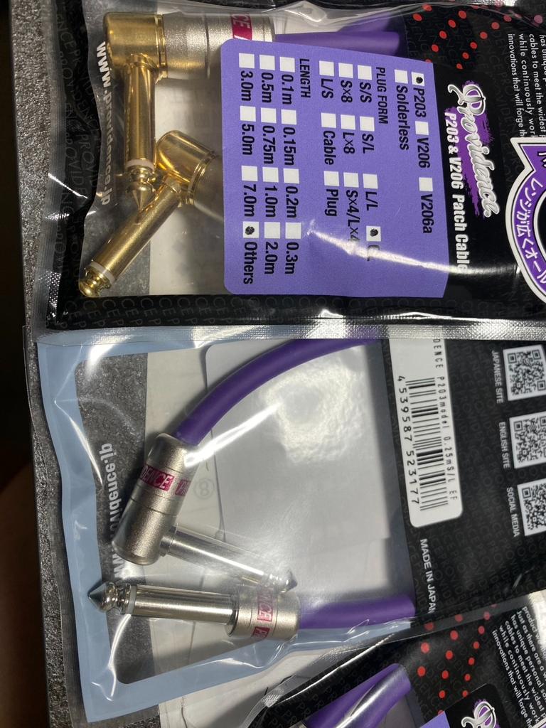 PROVIDENCE製パッチケーブルで最も有名なモデルはこのP203です。ギター/ベース問わず、プレイヤーでこの紫被膜ケーブルを知らない方はいないかと思います。ケーブルは柔らかくしなりがあり、断線しにくい印象です。同じパッチケーブルを約10年間ボードに入れて使ったことがありますが、特に断線などはありませんでした。さすがにプラグ部の消耗(メッキ剥がれなど)はありますが、消耗品なので当たり前ですね。新しいケーブルに変えるだけなので問題ありません。SS、SL、LL、CLANKとバリエーションが多く、特にCLANKモデルはあらゆる場面で重宝します。