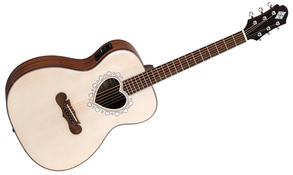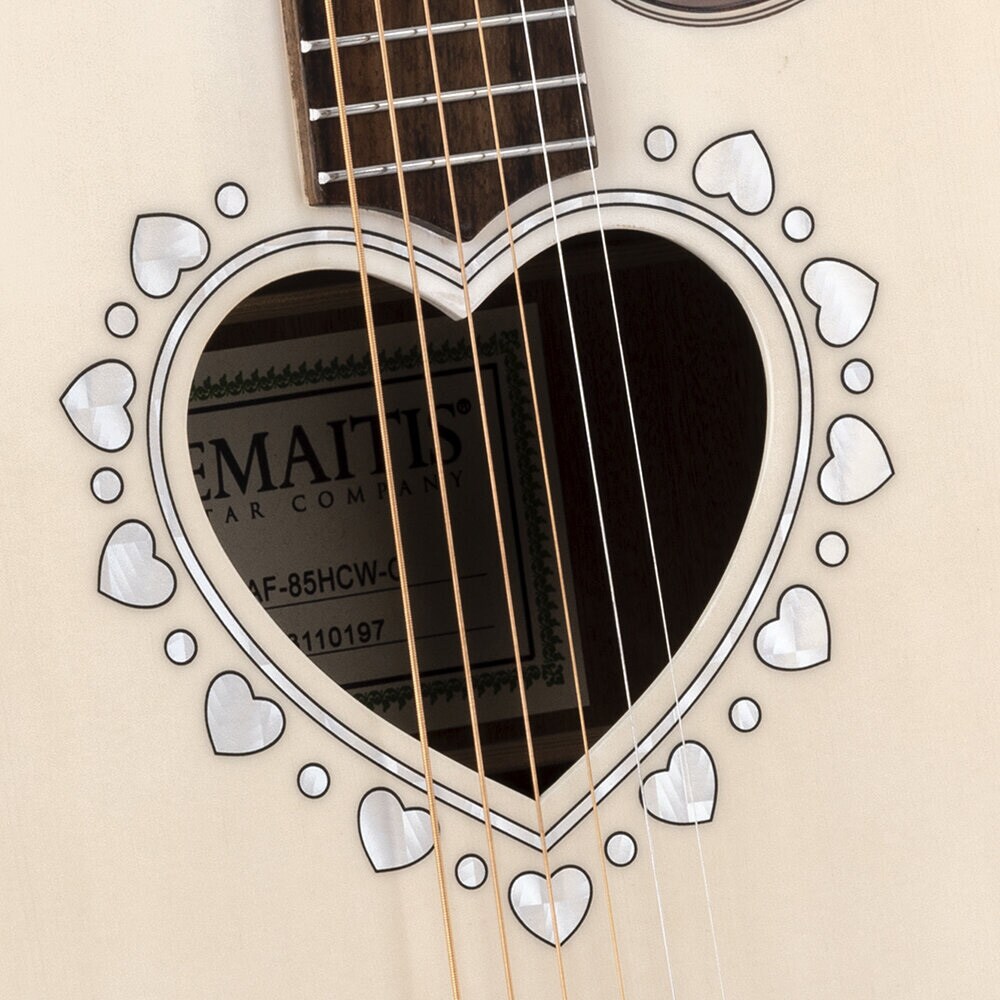The CAF-85H-C is a model produced by Chay, who is active in many fields as a singer-songwriter, model, and actress. It is an orchestra model with a popular heart sound hole, and is an electric acoustic guitar with a soft impression based on white with an antique finish off-white body top.