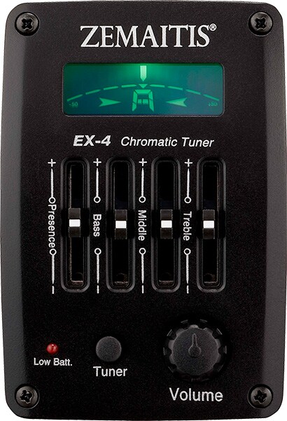 ●A preamp system that controls the sound from the under-saddle piezo pickup. Controls are volume, treble, middle, bass, and presence. It also has a convenient tuner function. It runs on a 9V battery.