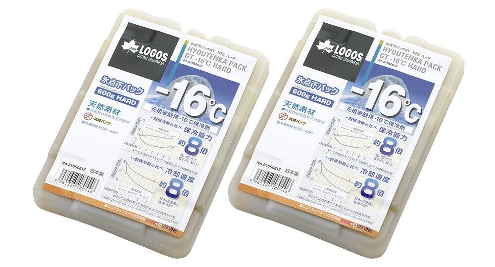 ●For an 8-liter cooler box, one freezing pack GT-16℃ Hard (600g) is the standard. However, this depends on the performance of the cooler and how it is used.