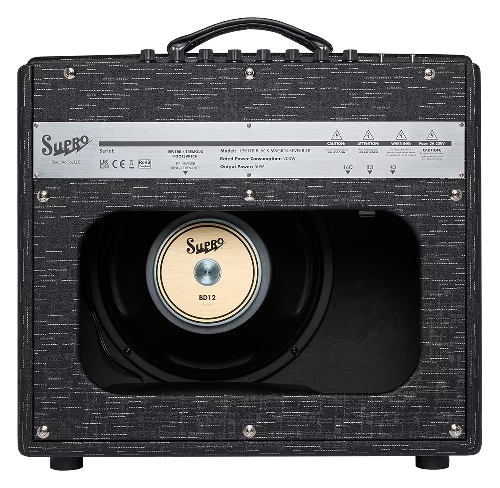 At the heart of this all-tube monster is a matched pair of military-grade Sovtek 5881 power tubes configured to deliver 35 watts of pure Class A power. In addition to the upgraded power section, the Black Magick Reverb TB features a ""Bright Cap"" modification on channel 1, which adds even more brilliance and versatility when blended with the original Black Magick preamp on channel 2. The two complementary channels are summed in parallel and sent to a two-band EQ, followed by tube-driven spring reverb and tremolo effects, and a master volume to tame the output as needed. This unique signature variant of the Black Magick Reverb is adorned with elegant Black Scandia tolex and features custom-built Supro BD12 speakers from Celestion.