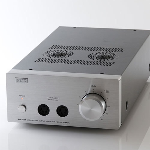 The SRM-500T is the successor to the SRM-006tS and follows the STAX's traditional tube driver circuit while achieving improved power supply efficiency and better sound quality. It uses a low-noise DUAL FET in the first stage and a high-voltage 6FQ7/6CG7 twin-triode tube in the output stage, while a newly designed power transformer saves power and improves sound quality.