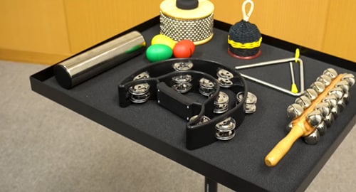 小物打楽器からマレット、マイクまで、必要なアイテムをすぐ手元に。どんな現場でも頼れる万能パーカッションテーブル。