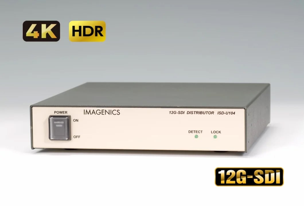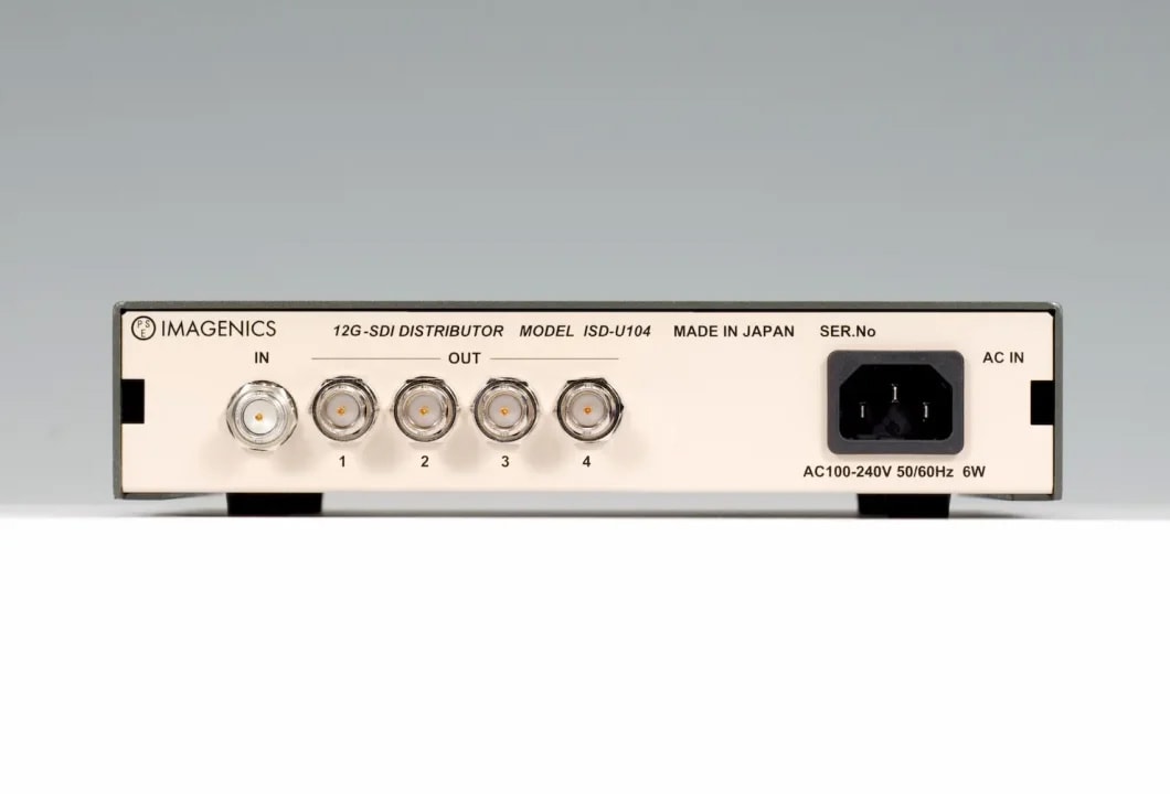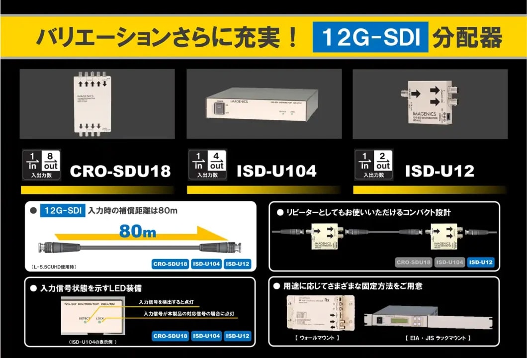This 1-input, 4-output distributor supports multiple standards, including 12G-SDI, 6G-SDI, 3G-SDI, HD-SDI, SD-SDI, and DVB-ASI. It enables long-distance 12G-SDI connections using the L-5.5CUHD cable.