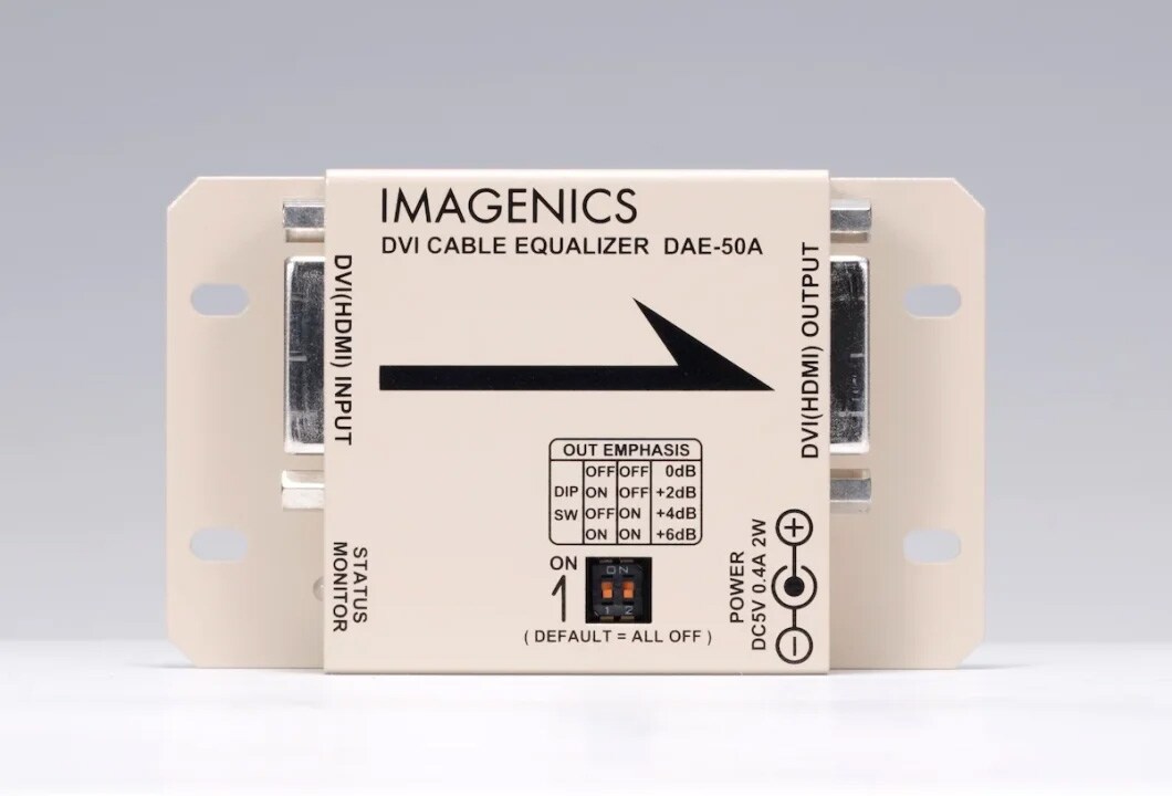 This compact, lightweight, and low-power DVI cable compensator can transmit digital video and audio signals conforming to the DVI or HDMI standard up to 50 meters using long DVI cables manufactured by Imagenics. It also supports HDCP (copyright protection) video signals.