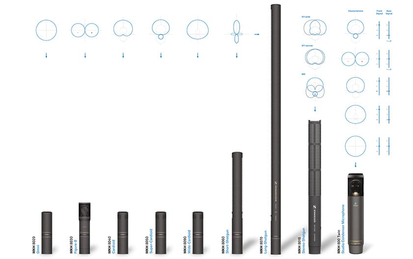 Part of a complete line of condenser microphones. The MKH 8000 Series includes all the standard polar patterns audio recording professionals need for a variety of applications.
