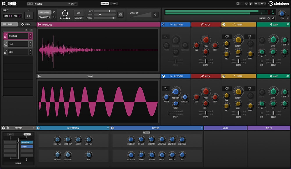 After the AI creates new kick, snare, and cymbal sounds, you can further edit them using Backbone's extensive suite of familiar tools. Decompose, layer, resynthesize, and apply various features to drum samples to create your own unique sound. If you like a particular sound but aren't completely satisfied, DrumGAN can quickly generate variations in the same style.