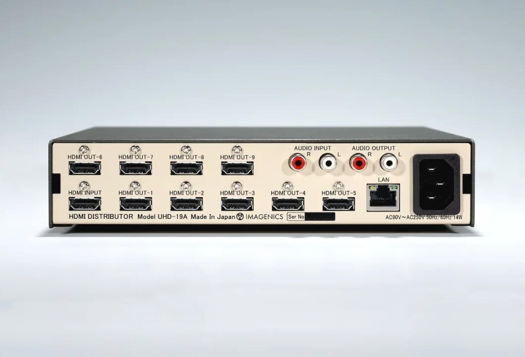 <<Aug 2025 New Product!>> This multi-functional HDMI splitter with one input and nine outputs supports 4K resolution HDMI signals. Each output channel is equipped with 4K → FHD down-conversion and color space conversion.