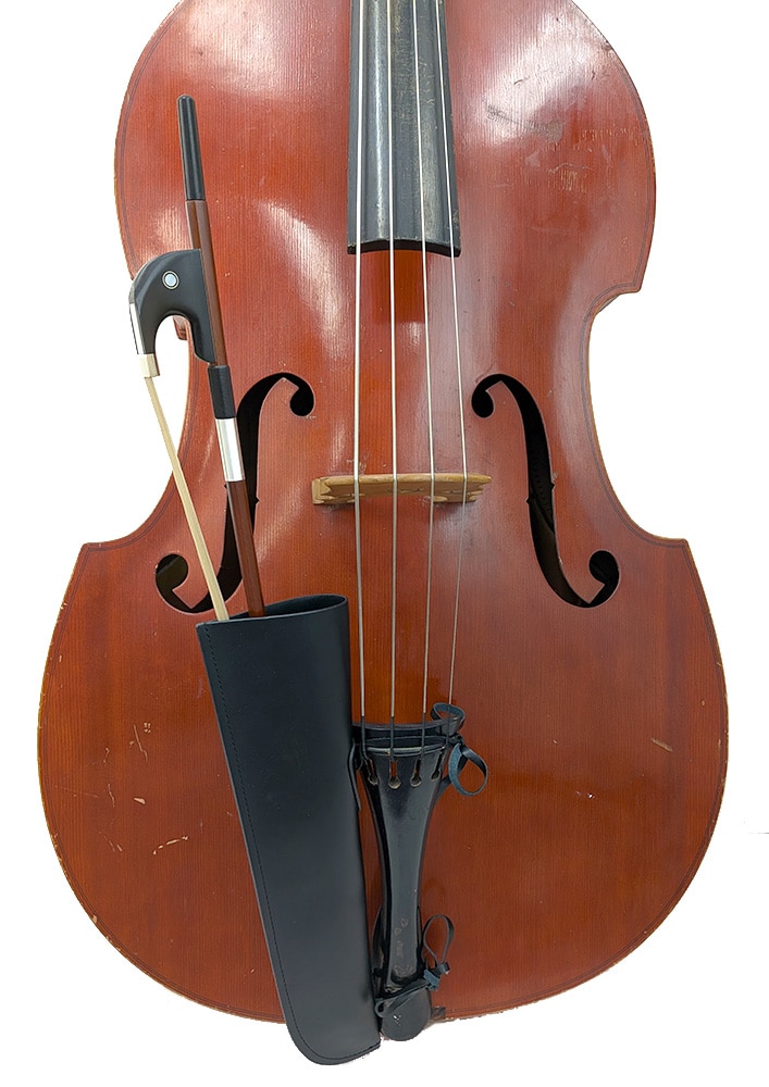 コントラバスの弓を即座に収納できる弓ホルダー。弓ホルスターとも呼ばれます。持ち替えが頻繁に要求されるシチュエーションで非常に重宝します!口が程よく開いている状態のため弓を挿しやすく、また挿している状態で弓がふらつかず良い具合にホールドされるのもポイント。ジャンル問わず全てのコントラバス奏者の方に使っていただきたいです!