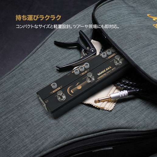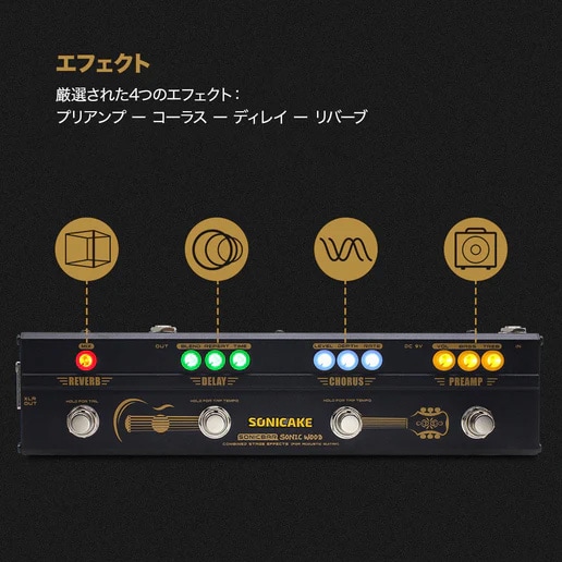 SONICAKE/Sonic Wood is a combination effects pedal designed for acoustic guitar. It features four carefully selected effects essential for acoustic guitar players, making it a truly ""one-stop"" solution. [LF]