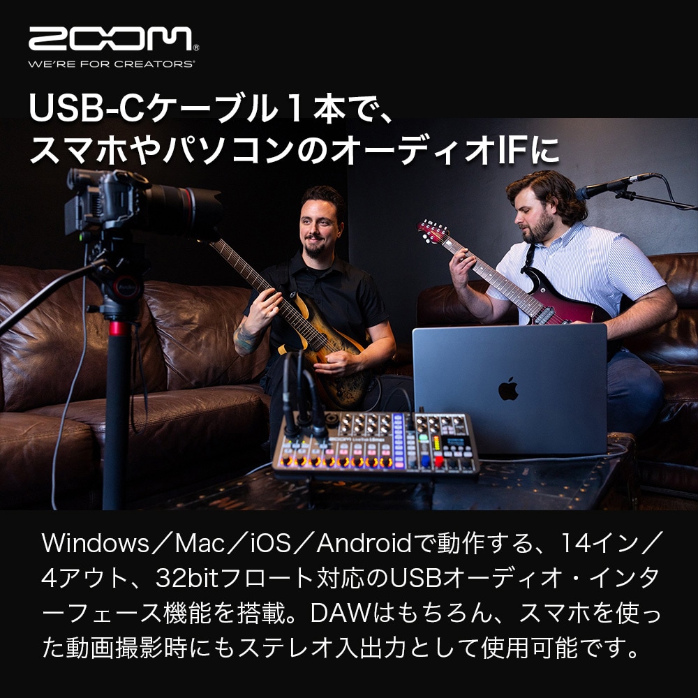 ◎USB audio interface function* with 14 inputs/4 outputs, 32-bit float, compatible with Windows, Mac, and iOS (allows simultaneous recording to the unit while live streaming)