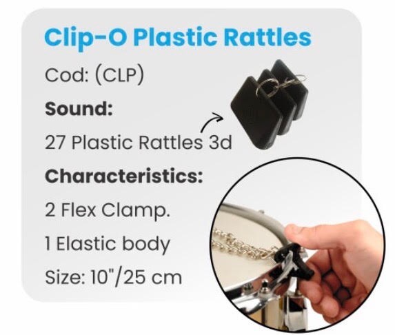 The Clip-O Plastic Rattle is a unique accessory featuring 3D-printed rattles strung along an elastic cord. With flexible clamps on both ends, it can be easily attached to drum hoops or cymbals, adding a distinctive plastic rattle effect to your performance. Perfect for enhancing grooves with extra texture or creating rhythmic layers, it delivers a highly percussive and expressive movement.