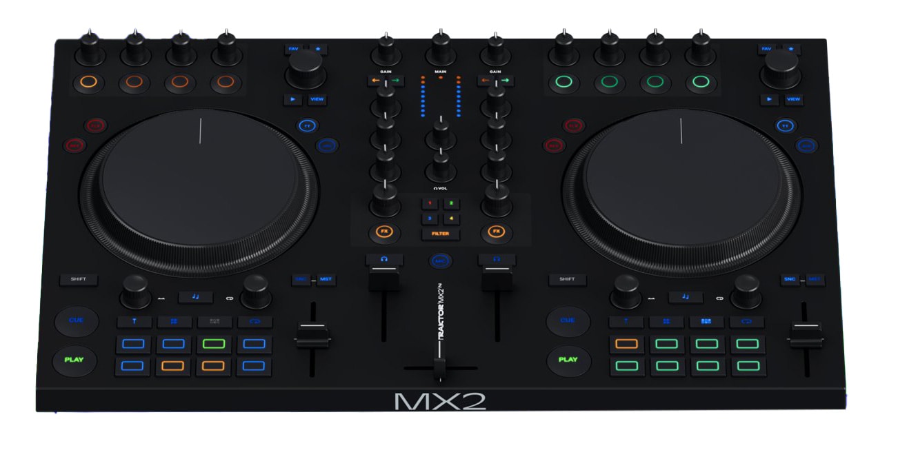 「Traktor MX2」はTraktor Pro 4に対応した2ch PCDJコントローラー。コンパクトながらも、機能性と使い勝手の良さ、音質を兼ね合わせ、ホームユースから現場への持ち込み機にも最適。Traktor Pro 4の永続版が付属し、ビートマッチやステム機能、40種以上のエフェクトのほか、16個のRGBパッドによる多彩な演奏が可能。内蔵の24 bit/96 kHzオーディオインターフェースは高品位なサウンドを実現。