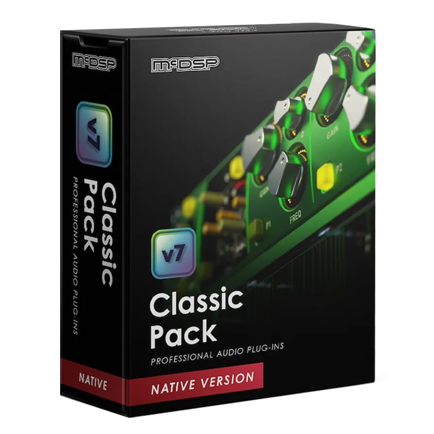 FilterBank、CompressorBankなど、Pro Tools用EQ、コンプレッサーの代名詞になっているプラグインをリリースしているMcDSP。 その名前を知らない人でも、スタジオや、「ギター/ボーカル録音テクニック」といった雑誌の特集で、グリーンのインターフェースを目にした事があるのではないでしょうか。 そんなMcDSPのFilterBank、CompressorBankに、アナログ・ヘッドアンプ & テープマシンのサウンドを再現するAnalog Channelと、自由にニーを調整可能な仕様などCompressorBankゆずりの柔軟性を備えたマルチバンド・コンプMC2000をバンドルしたClassic Pack