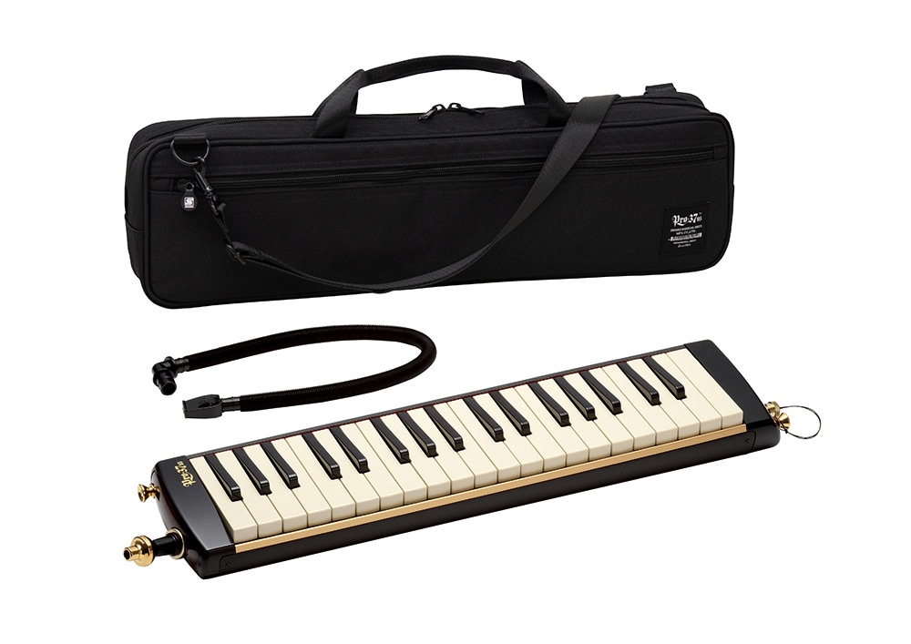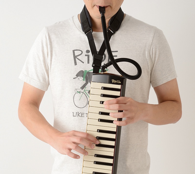 PRO-37v3通常モデルにネックストラップ用のリングを取り付けたモデル。スムーズな発音で木管楽器のようなソフトな音から、金管楽器のような力強い音まで演奏できます。リングにネックストラップを取り付け、サックスのように首から掛けて両手弾き演奏可能です。