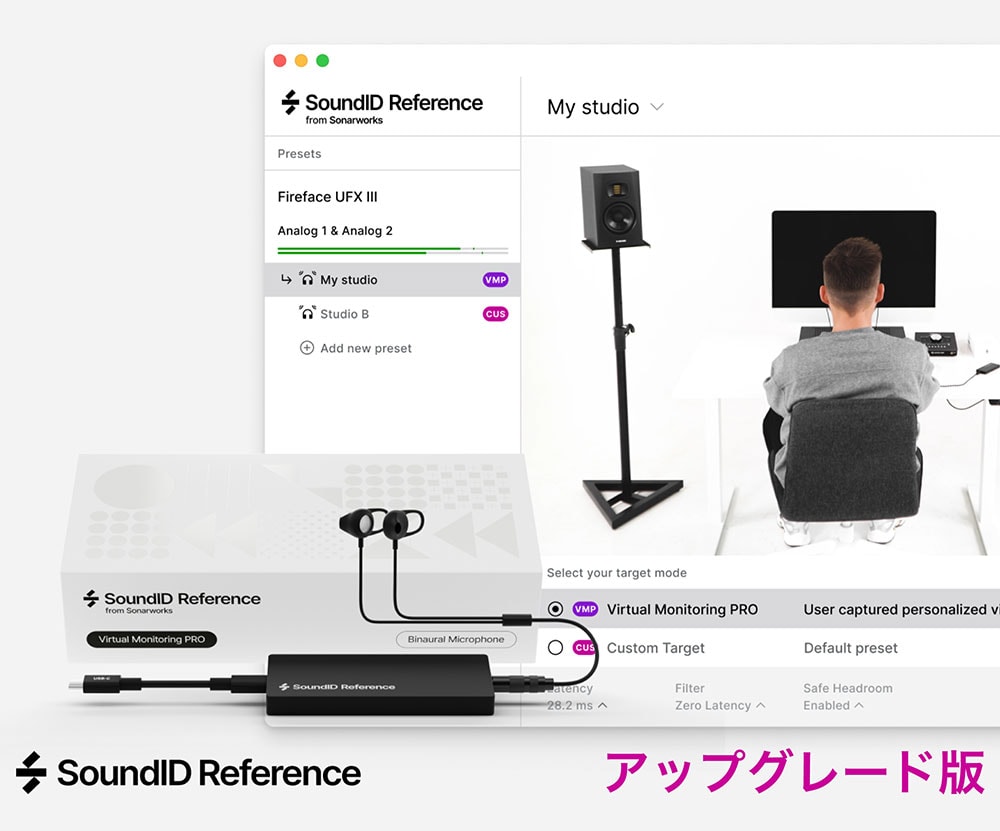 スタジオや部屋などの再生環境をヘッドホンで再現 いつでも、どこでもミックスチェックや制作作業が可能に。専用測定用イヤホン型バイノーラルマイク付属。対象製品のユーザー専用のアップグレード版。