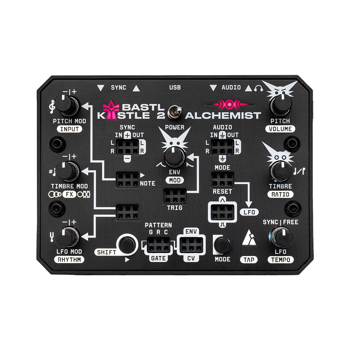 Kastle2 Alchemist features a carefully tuned, wide tonal range. Its five synthesis modes—FILTER, FM, HYPERSINE, SUPERSAW, and GLITCHNOISE—accessible via the main TIMBRE sweep, can be further refined using the RATIO control.