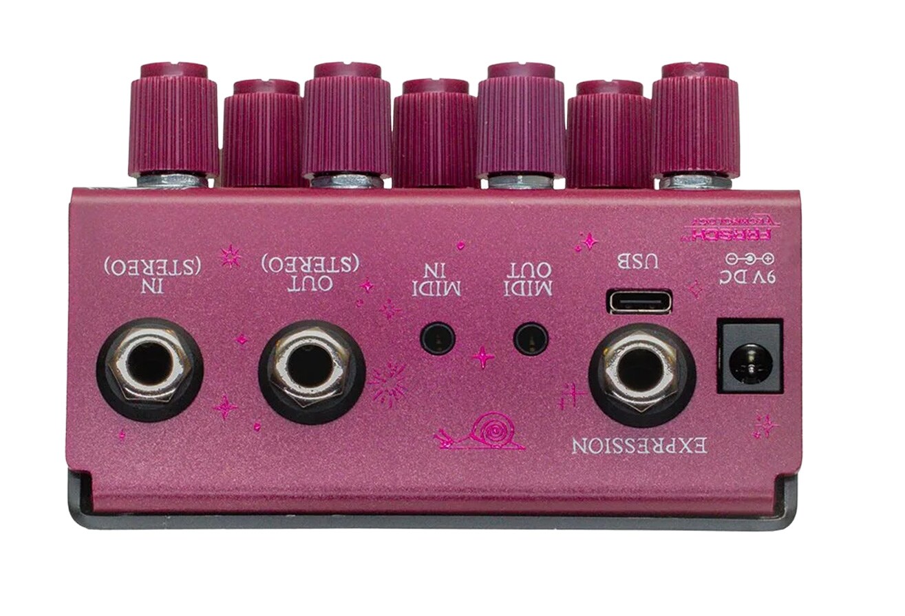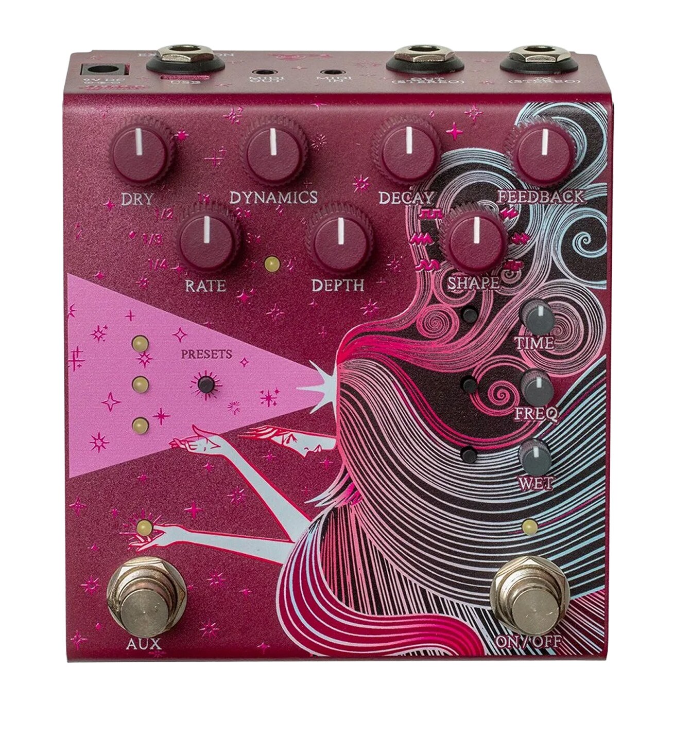 The AUX switch can be switched between modes to enable tap tempo, reverb hold, and preset switching. The EXP control can be assigned to all knobs, expanding the flexibility of foot control.