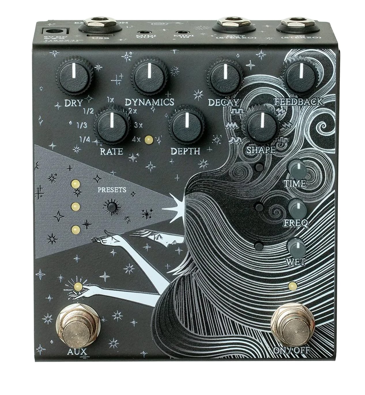 The AUX switch can be switched between modes to enable tap tempo, reverb hold, and preset switching. The EXP control can be assigned to all knobs, expanding the flexibility of foot control.