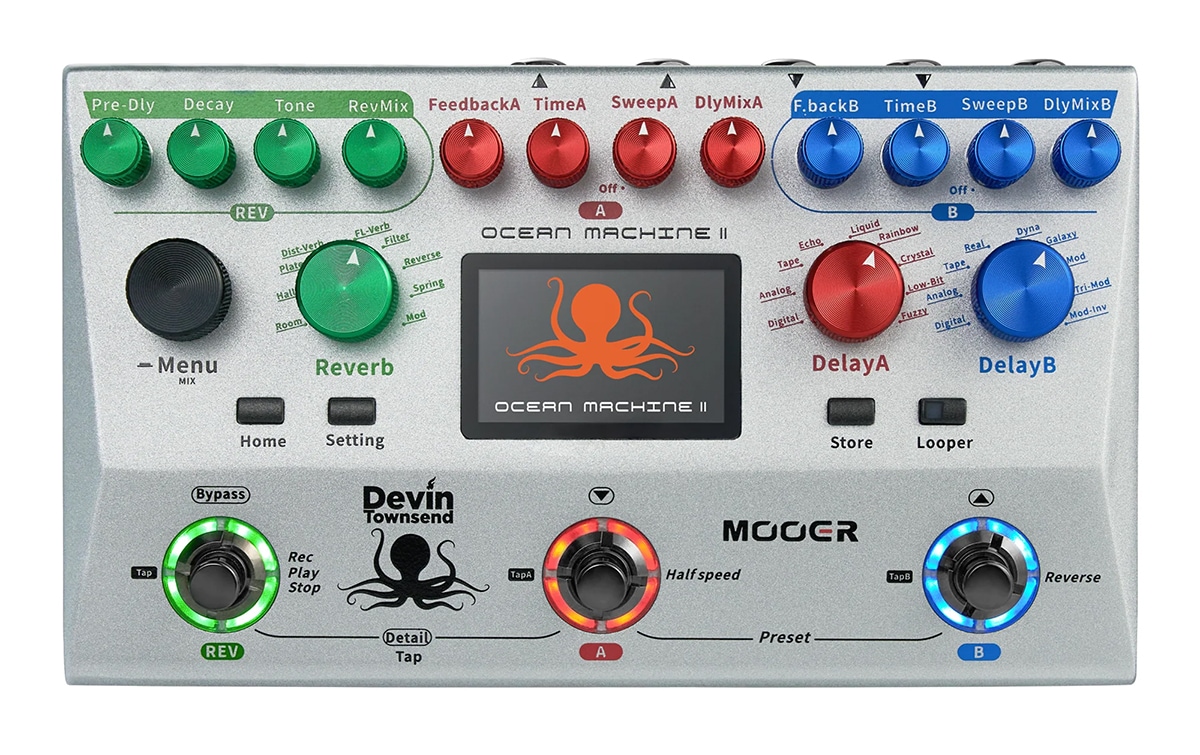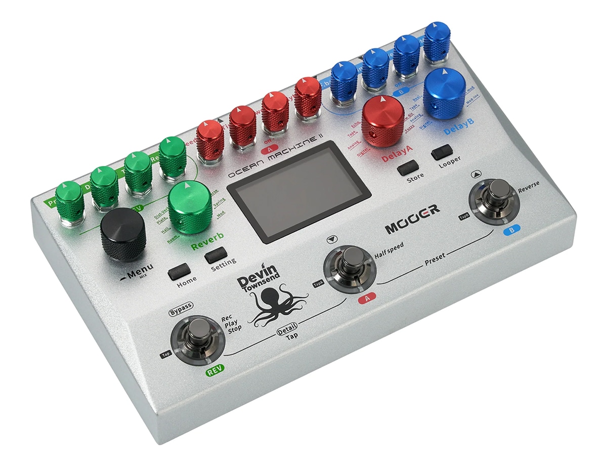 The Mooer Ocean Machine II is a dual delay, reverb, and looper pedal, the second collaboration with Devin Townsend. [LF] The updated Ocean Machine II features optimized ambient algorithms, nine delay and reverb effects, and a 120-second looper, all controlled from an easy-to-use interface.