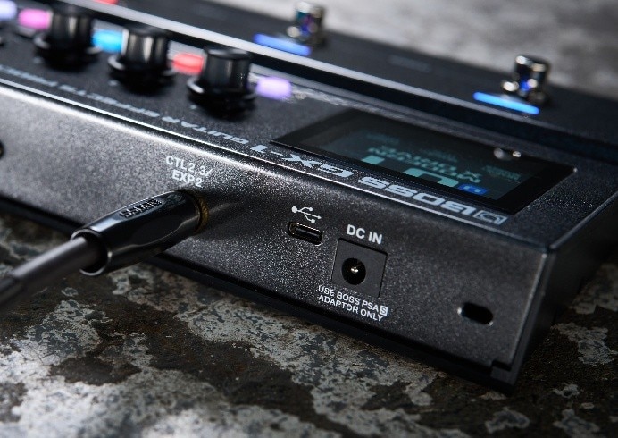 納得のいくサウンドができたらGX-1とともにステージへと上り、柔軟なコントロール性能を用いてパフォーマンスしましょう。3つのフットスイッチとエクスプレッション・ペダルは機能のカスタマイズに対応し、エフェクトのオン/オフから複数のパラメータを同時に変更するといった高度な操作まで、自由に割り当て可能です。さらに、CTL 端子またはBluetooth🄬を用いたワイヤレスで別売りのコントローラーを接続することで、いっそう多くの機能をコントロールできます。また、GX-1 は電池、AC アダプター、USBの3 電源方式を採用しているため、練習や演奏の場を選びません。