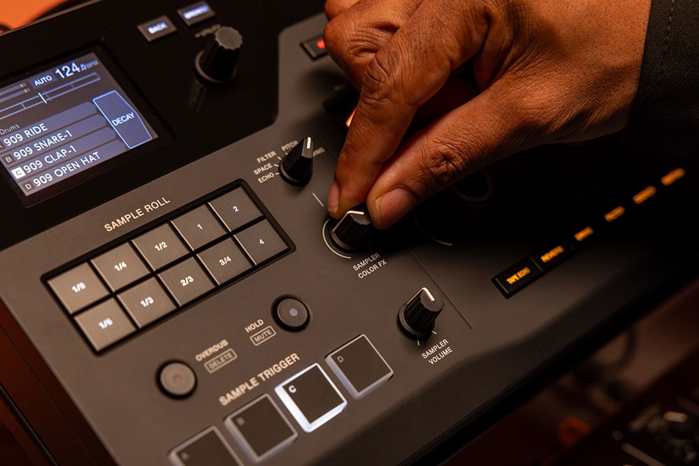 3-BAND FXのサブパラメータやSAMPLERのロード済みサンプル音源、選択中のSAMPLER COLOR FX、BPMや入出力レベルなどを確認可能。さらに、サンプル音源をブラウズして素早く選択でき、迷いのない操作で演奏に集中できます。