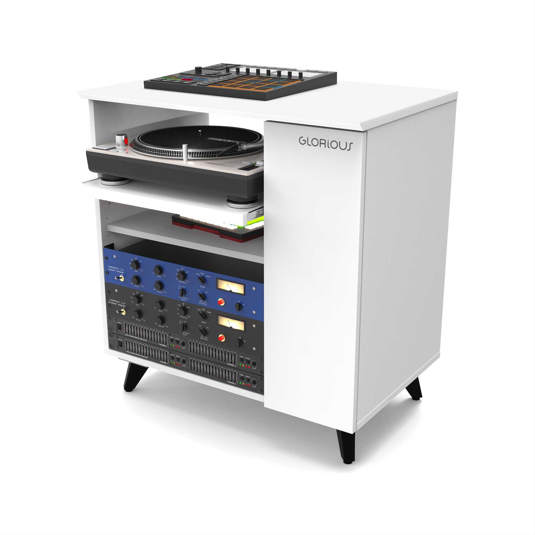スタジオのレイアウトは十人十色。だからこそ、このラックは最大限の柔軟性を備えています。可動式の棚板、引き出し、12Uのラックスペースは、それぞれ高さ調整が可能で、プリアンプ、エフェクト機器、ドラムマシン、ターンテーブルなど、用途に応じた最適なセッティングが可能です。