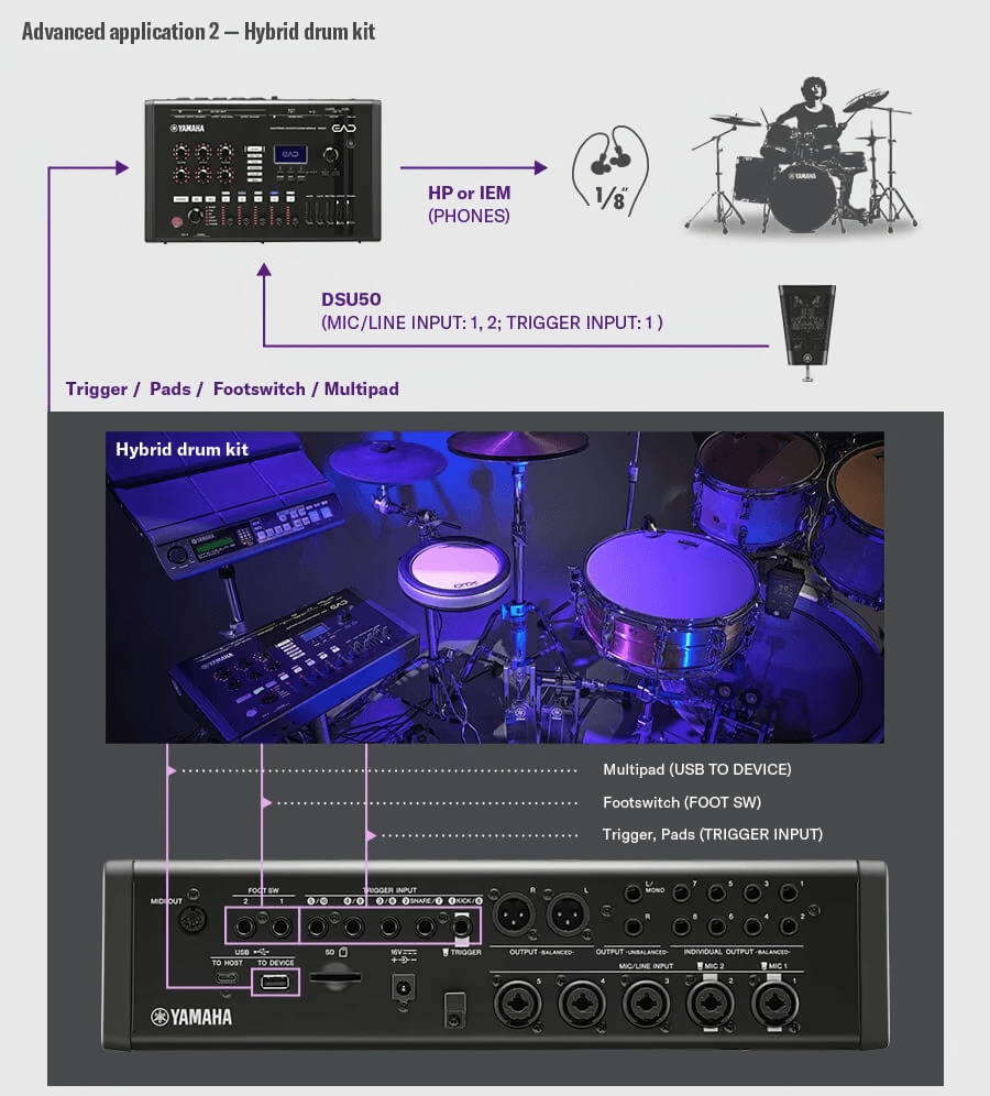 従来ドラムのサウンドメイクはPA側に頼る部分が大きく、 ドラマー自身で細かい音の調整をすることは困難でしたが、『EAD50』を使うことで、音色変更やエフェクトなどの演奏効果をドラマー自身でリアルタイムにコントロールでき、より多彩な演奏表現を楽しめます。また、電子ドラムパッドやトリガーなどをセットに組み込み接続することで、アコースティックドラム、エレクトロニックドラムのハイブリッドキットを構築することができ、演奏表現の幅を大きく広げます。