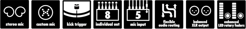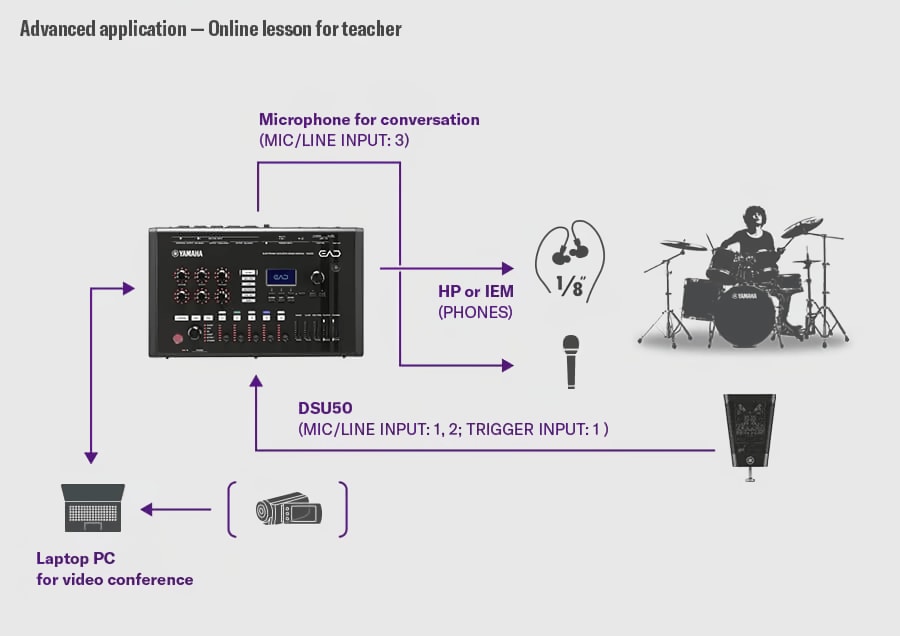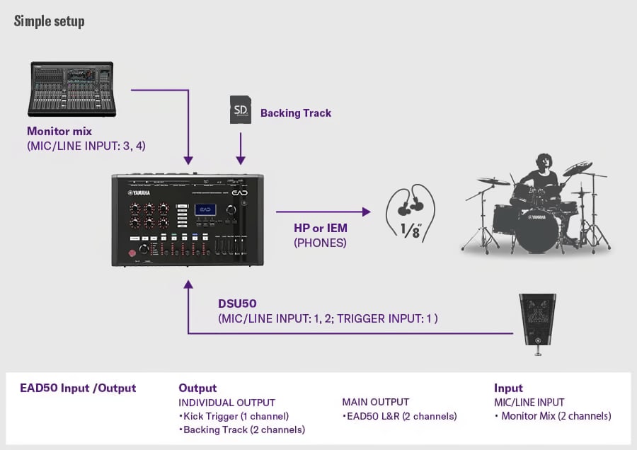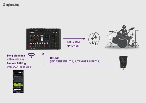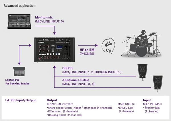 さらに、ミキサー、エフェクター、ドラム音源モジュールなど多くのドラム周辺機能を兼ね備えているため、EAD50一つで手軽にドラムのPAセットアップが可能です。