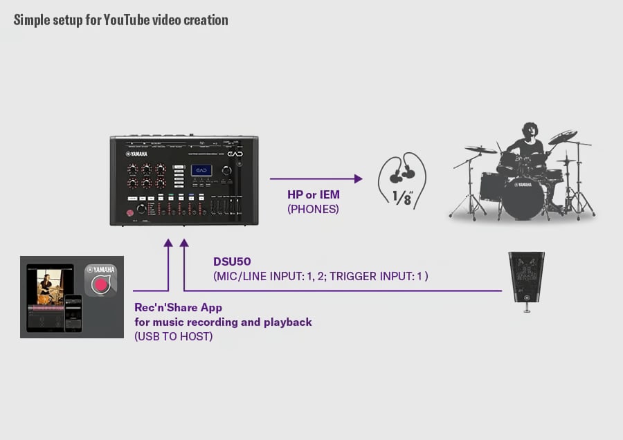 EAD50を使用すれば、複雑なセッティングを行うことなく、高品位なドラム録音が可能です。 PCと接続することで、モジュールからのダイレクトなマルチトラック録音にも対応。クリアで高品質なトラックを簡単に収録できます。さらにスマートフォンやタブレットと接続すれば、Rec’n’Shareアプリと連携し、SNS向けの高音質な動画コンテンツをすばやく制作可能。共有までスムーズに完結します。
