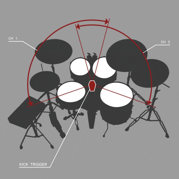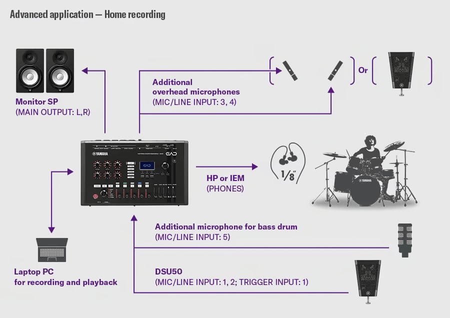 アコースティックドラムセット全体を収音する場合は、専用のDSU50センサー・ユニットを接続できます。必要に応じて、最大5本の外部マイクを追加して使用することも可能です。