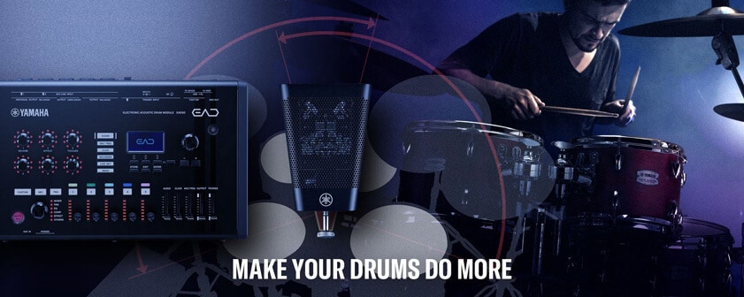 EAD(Electronic Acoustic Drum module)は、専用のセンサー・ユニットを取り付けるだけでドラム全体をステレオ収音し、エフェクトや音源を組み合わせた表現が手軽に行える、ヤマハ独自の製品です。
