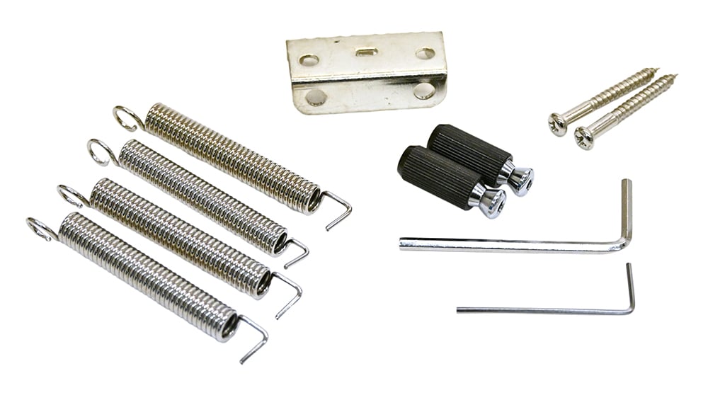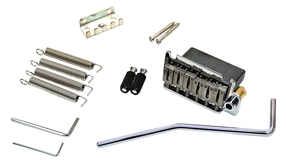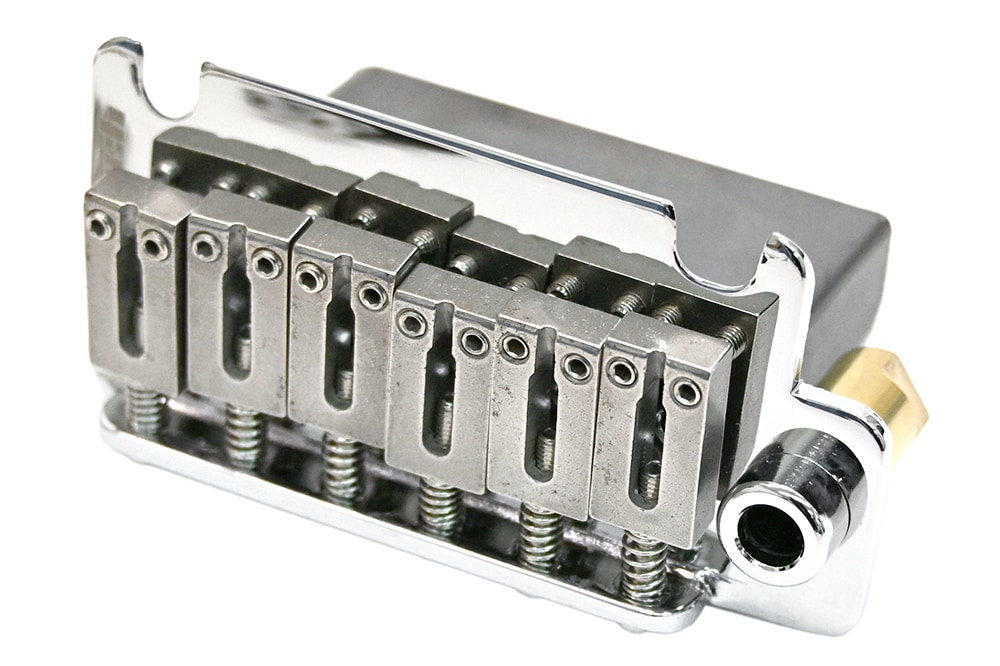 ステンレスサドルと40mm厚スチールブロックを採用した、ギター用トレモロユニット。ステンレスならではの硬質で立ち上がりの早いレスポンスと、スチールブロックによる豊かなサステインを両立しています。弦間ピッチには、弦落ちを防ぎスムーズな運指をサポートする10.5mmを採用。エントリーモデルのアップグレードや、低予算でよりクリアでモダンなサウンドを追求したい方に最適です。