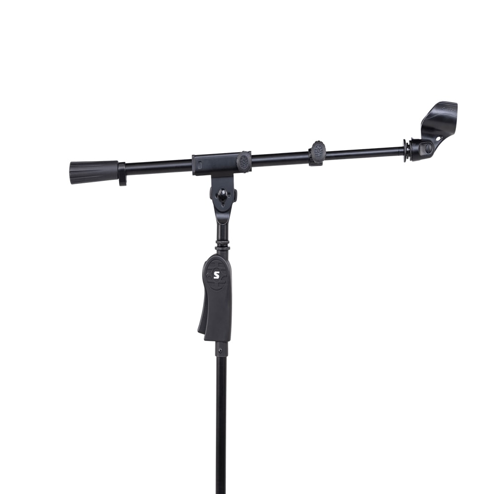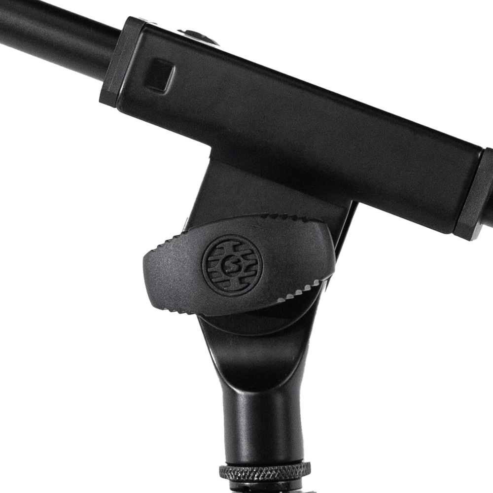 片手で操作可能なピストルグリップ式クラッチは画期的な機能で、45~69.5インチ(約114~227cm)の範囲で素早く高さ調整が可能。幅広い用途に対応します。折りたたみ式三脚ベースは設営・撤収を効率化し、滑り止めゴム足が安定性を確保。ライブパフォーマンスの細かな要求に応え、足部に追加されたホワイトトリムは低照度環境での安全性を高める設計です。ケーブル管理クリップがケーブルを確実に固定し邪魔にならないため、パフォーマンスに集中できます。米国規格と欧州規格の両方のマイククリップに対応しています。