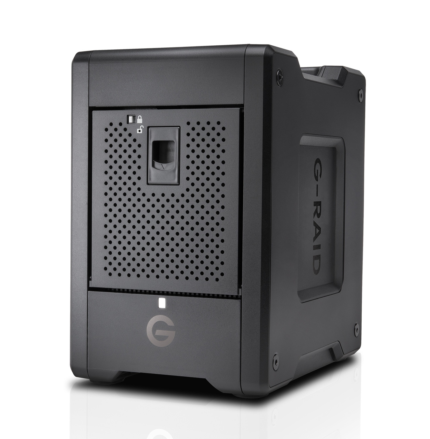Thunderbolt 3対応の4ベイRAIDストレージ「G-RAID SHUTTLE 4」。RAID 0/1/5/10に対応し、最大1,000MB/s(RAID 0時)の高速転送で4K・8K映像編集にも対応可能。持ち運びやすい取手付きデザインで、現場への移動もスマート。Thunderboltポート×2とデイジーチェーン接続も備え、拡張性も高いです。