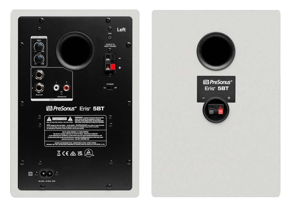 PreSonus® Eris® 5BTは、Bluetooth® 5.0によるワイヤレス接続、またはリアパネルの1/4インチTRSおよびRCA入力、そしてフロントパネルの1/8インチステレオライン入力を介して、ほぼすべてのラインレベルオーディオソースに有線接続できます。また、フロントパネルには便利な(そして大音量!)1/8インチステレオヘッドフォンジャックも搭載。ヘッドフォンを接続するとスピーカーがミュートされます。