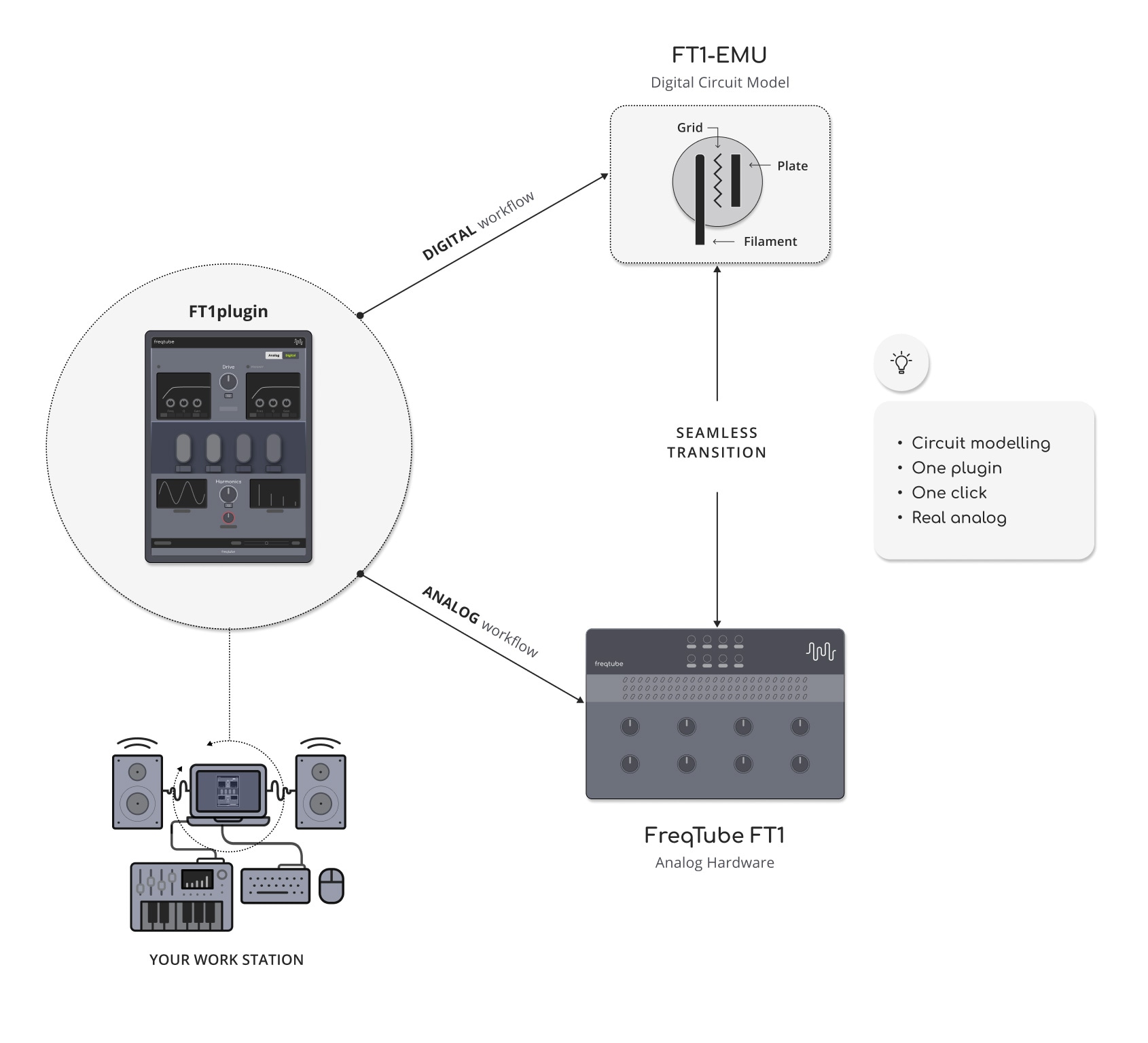 FT-1-EMU は、これまでハードウェアでしか得られなかったサチュレーション、豊かな倍音、そして自然なダイナミクスを、完全なソフトウェアプラグインとして DAW 内に取り込みます。