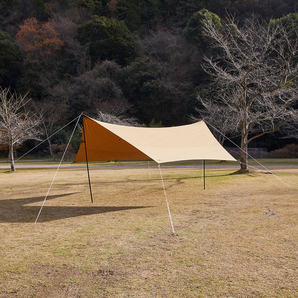 TC(ポリコットン)素材を採用した、シンプルで扱いやすいヘキサタープ。コットンとポリエステルの混紡生地により、高い遮光性と通気性を兼ね備え、夏場でも快適な日陰空間を作り出します。火の粉が当たっても穴が空きにくい素材のため、焚き火を楽しむキャンプシーンにも適しています。