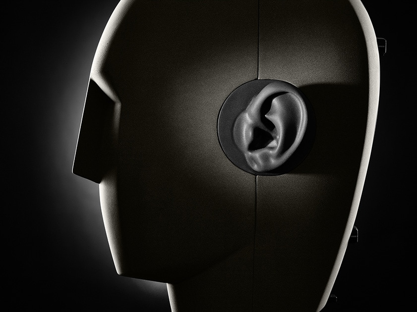 バイノーラル録音するには、耳の模型のみを用意する方式、実際の人間の耳の位置にマイクを仕込む方式、そして頭の模型(ダミーヘッド)まで用意して録音する方式などがあり、KU 100はダミーヘッドに分類されます。人間が上下左右前後を感じるうえでは、耳だけでなく、頭の形状も大きく関与しているため、ダミーヘッドは様々な録音方法の中でも高いリアリティを提供出来るバイノーラル録音方式です。